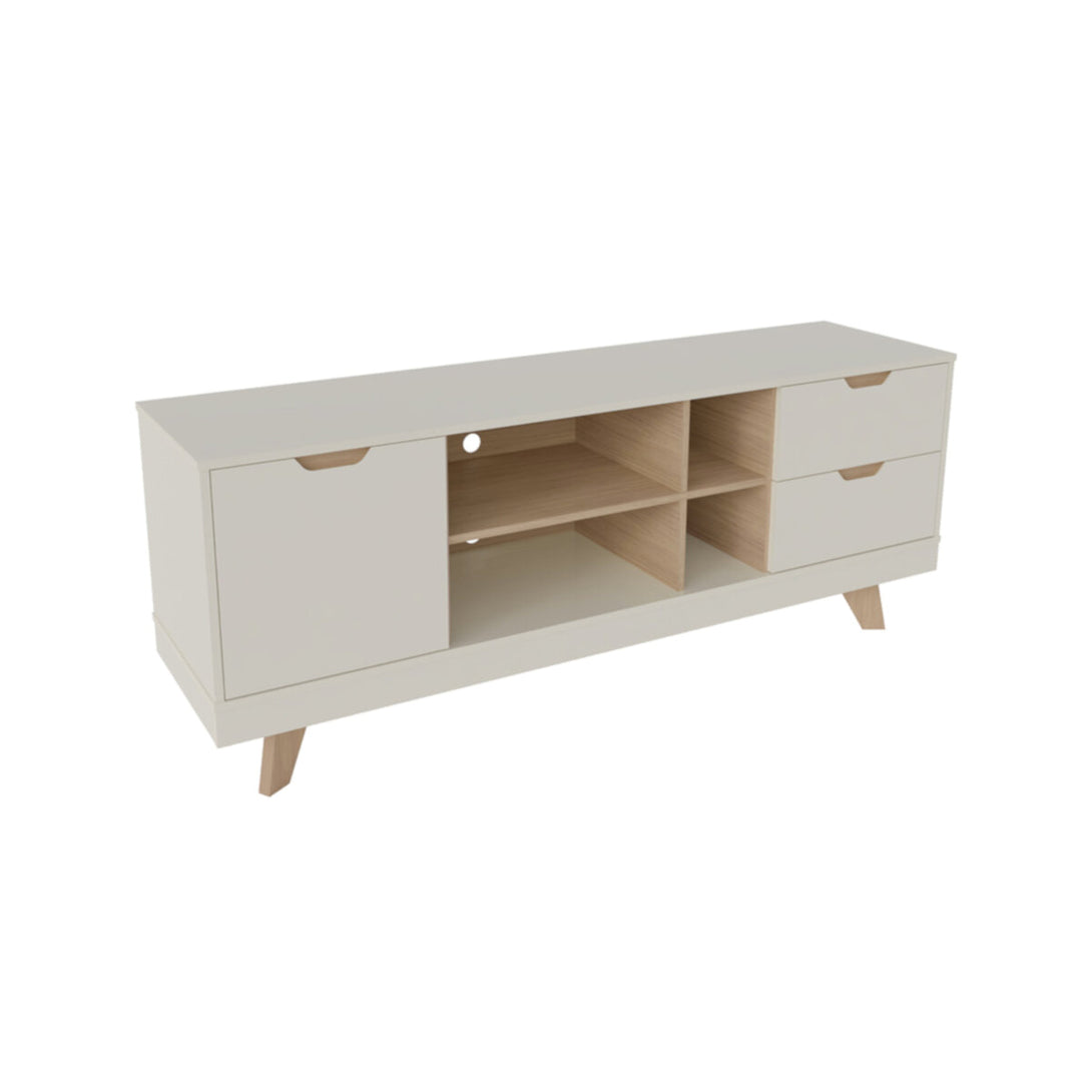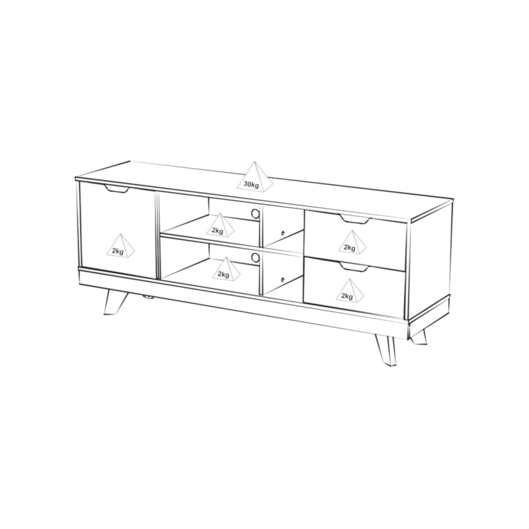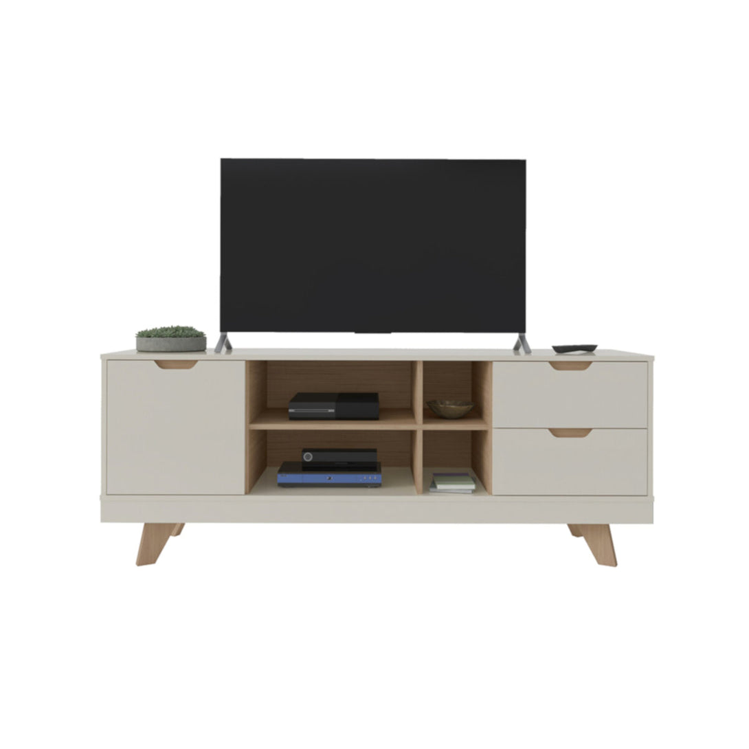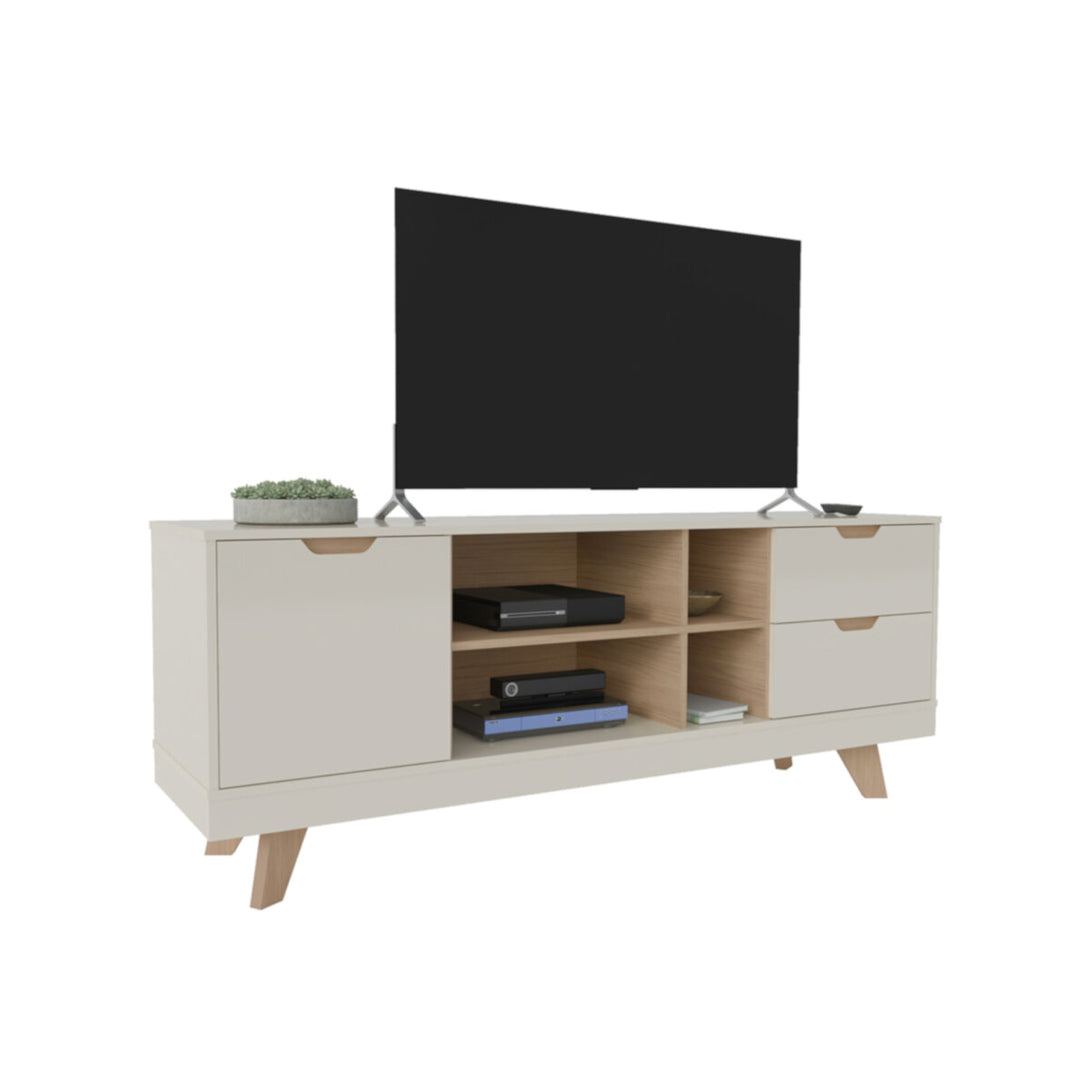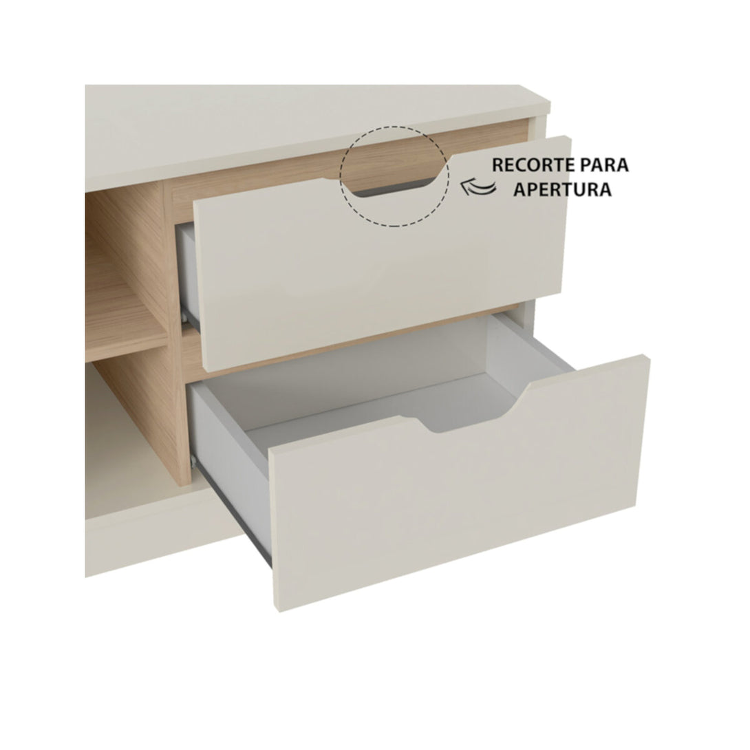 Soporta una televisión de hasta 65 pulgadas. Una puerta con bisagra de metal. Pies de MDF 25mm. 2 cajones con detalle de recorte para apertura. El acabado del mueble se asemeja al de la madera, está hecho en pintura UV texturizada, y el color blanquecino está hecho en pintura UV alto brillo, ambos de larga durabilidad y fácil limpieza. Garantía válida únicamente por defecto de fábrica.