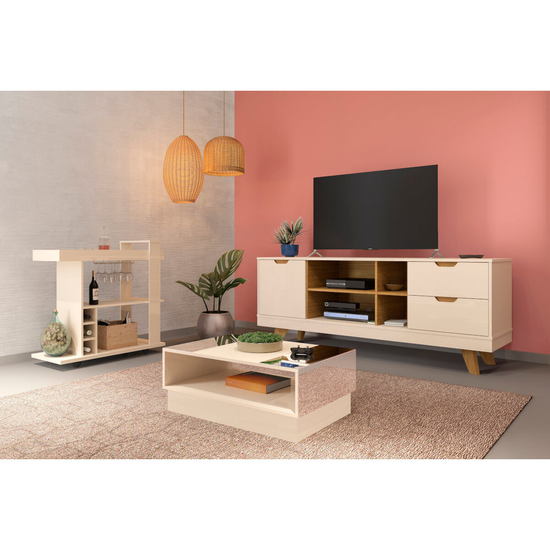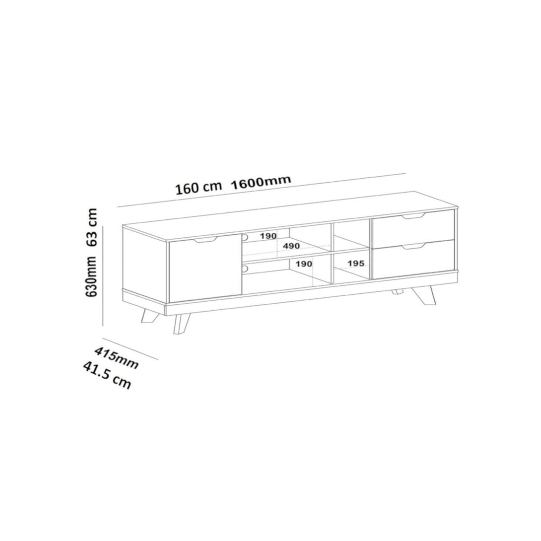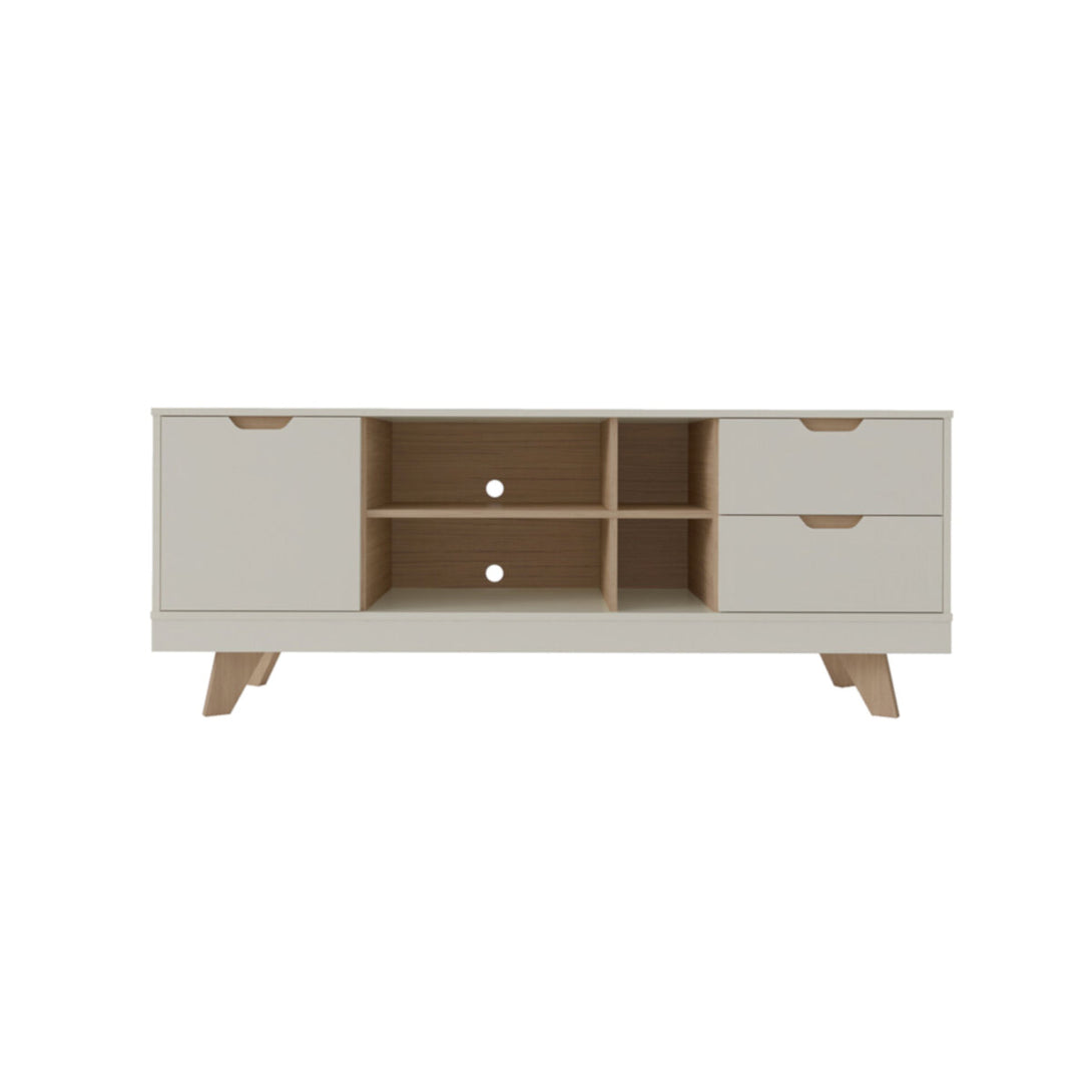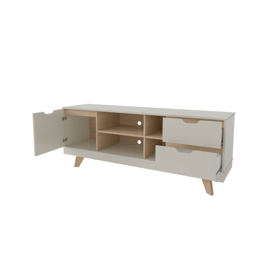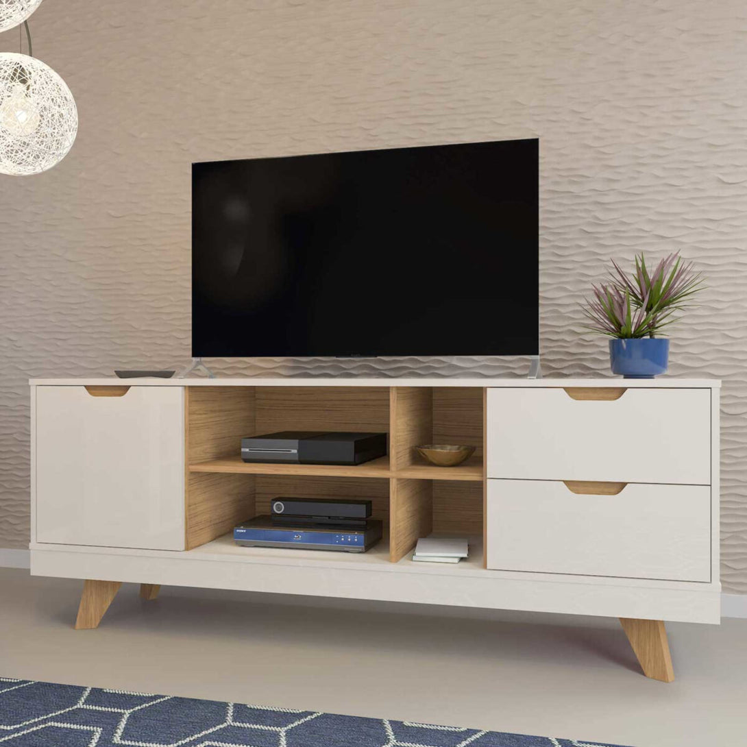 Soporta una televisión de hasta 65 pulgadas. Una puerta con bisagra de metal. Pies de MDF 25mm. 2 cajones con detalle de recorte para apertura. El acabado del mueble se asemeja al de la madera, está hecho en pintura UV texturizada, y el color blanquecino está hecho en pintura UV alto brillo, ambos de larga durabilidad y fácil limpieza. Garantía válida únicamente por defecto de fábrica.