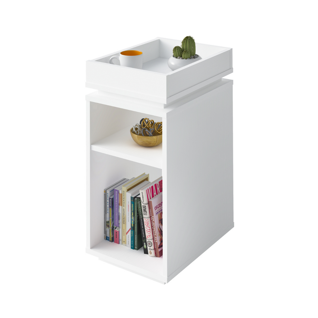 Mesa lateral modelo: Olívia. Sus trazos lineales hacen este producto versátil y multiusos; ya que puede ser usado en varios ambientes de la casa, como mesa para acomodar libros revistas, documentos y objetos que se necesiten tener a la mano, así como colocarse al lado del sillón para colocar café, botana, bebidas, o los controles remotos de la TV, aparatos electrónicos, video juegos y más. Disfruta de su diseño, practicidad y sobre todo, combínalo con los demás muebles que tiene para ti. Producto armable. Acabado en pintura UV. 2 amplios nichos de almacenamiento. Tapa en forma de charola. Diseño Garantía válida únicamente por defecto de fábrica.
