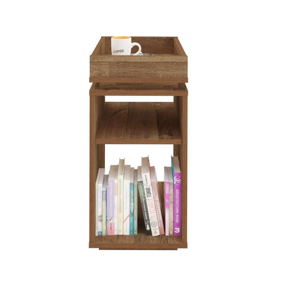 Mesa lateral modelo: Olívia. Sus trazos lineales hacen este producto versátil y multiusos; ya que puede ser usado en varios ambientes de la casa, como mesa para acomodar libros revistas, documentos y objetos que se necesiten tener a la mano, así como colocarse al lado del sillón para colocar café, botana, bebidas, o los controles remotos de la TV, aparatos electrónicos, video juegos y más. Disfruta de su diseño, practicidad y sobre todo, combínalo con los demás muebles que tiene para ti. Producto armable. Acabado en pintura UV. 2 amplios nichos de almacenamiento. Tapa en forma de charola. Diseño Garantía válida únicamente por defecto de fábrica.
