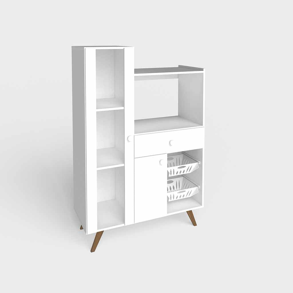 Mueble para microondas modelo: RT 3059. Este mueble está pensado y fabricado para ser tu aliado en la cocina. Tiene un increíble tamaño y diversos espacios de almacenamiento. Iniciando con un espacio para microondas con medidas: 58.2 cm largo x 45.5 cm alto; seguido de 1 cajón con correderas metálicas y jaladera circular ABS. 1 puerta abatible con jaladera circular ABS, y a su costado 2 canastas de plástico pensadas para que puedas colocar tus frutas y verduras. Del lado izquierdo del mueble, viene una pequeña, pero muy práctica estantería con 3 niveles de almacenamiento que son ideales para colocar una colección de tazas, guardar diversos frascos y alimentos y diversos artículos de cocina. Viene con 5 patas que le brindan estabilidad y soporte al mueble. Tiene un acabado en pintura UV de larga durabilidad y fácil limpieza.