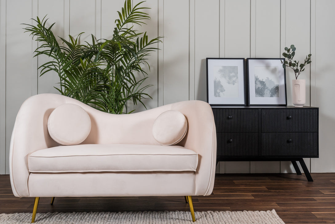 Sofá de 2 plazas Tapizado en Terciopelo Color Beige. Estructura de Madera Sólida y Patas de Metal